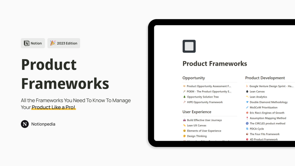 The Product Framework Toolkit is a comprehensive collection of 40+ essential frameworks that guide you through every step of product development. It includes everything from Product Opportunity Assessment to AARRR Pirate Metrics and Design Thinking.
